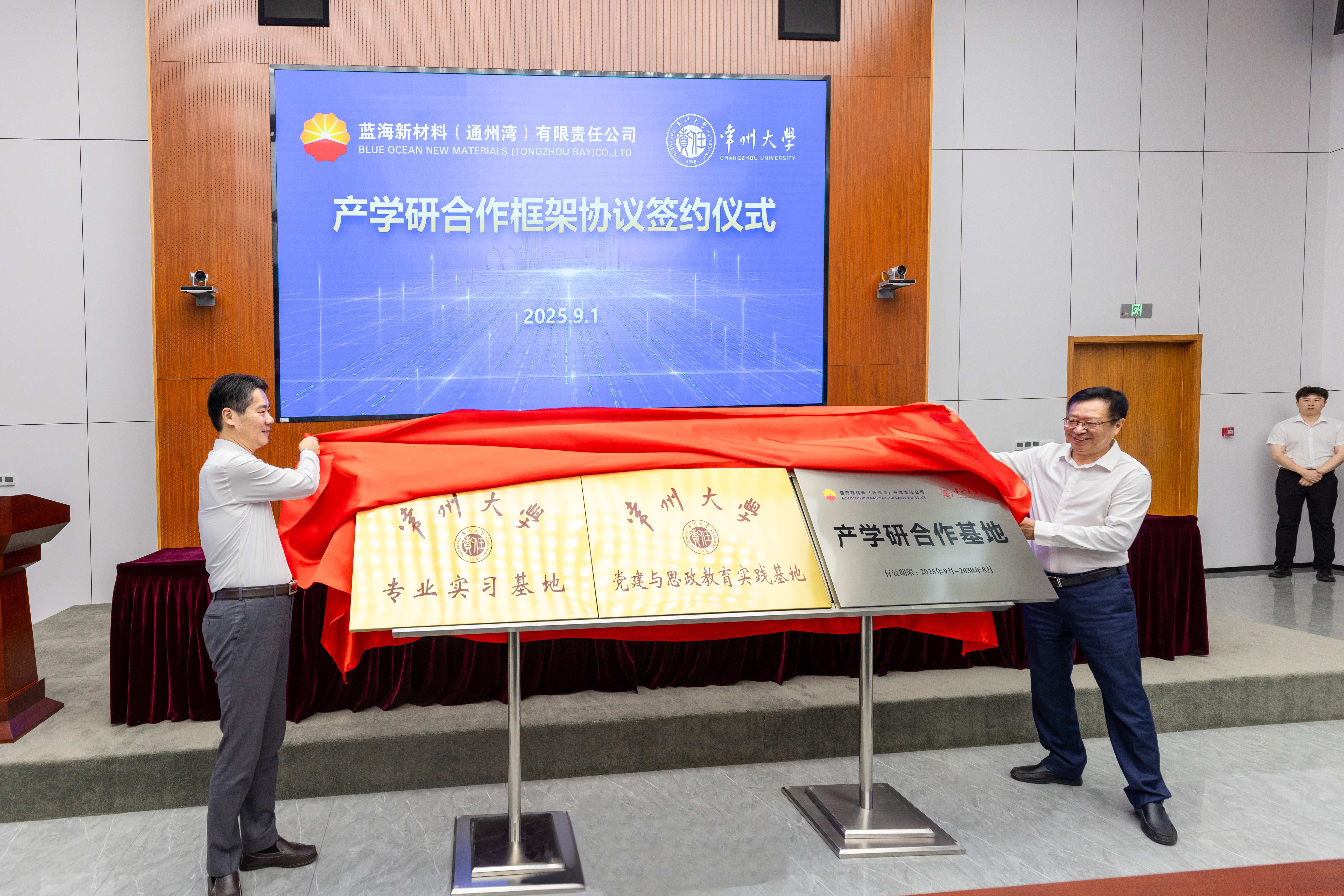 9月1日,常州大學(xué)與藍(lán)海新材料(通州灣)有限責(zé)任公司(以下簡(jiǎn)稱(chēng)“藍(lán)海新材料”)合作簽約儀式舉行。藍(lán)海新材料黨委書(shū)記、執(zhí)行董事李貴合,總經(jīng)理田春光,黨委副書(shū)記、紀(jì)委書(shū)記、工會(huì)主席陶建文,黨委委員、副總經(jīng)理勞國(guó)瑞,以及設(shè)計(jì)管理部、生產(chǎn)技術(shù)部、綜合管理部、(黨委)辦公室、黨委組織部(人力資源部)相關(guān)負(fù)責(zé)人出席,常州大學(xué)黨委副書(shū)記、校長(zhǎng)陳海群,原黨委書(shū)記陳群,副校長(zhǎng)晏成林及黨委組織部、學(xué)生工作部、能源化工行業(yè)創(chuàng)新處等相關(guān)部門(mén)負(fù)責(zé)人參加會(huì)議。田春光主持儀式。